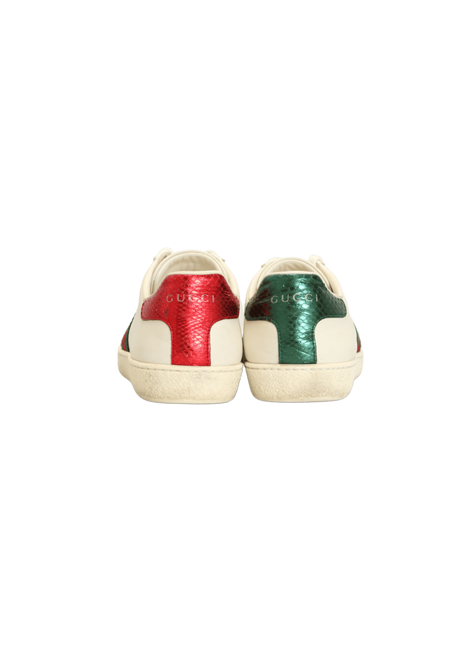 - Couro branco, couro metalizado com textura snakeskin nas cores vermelho e verde, faixa Web e bordado Bee;