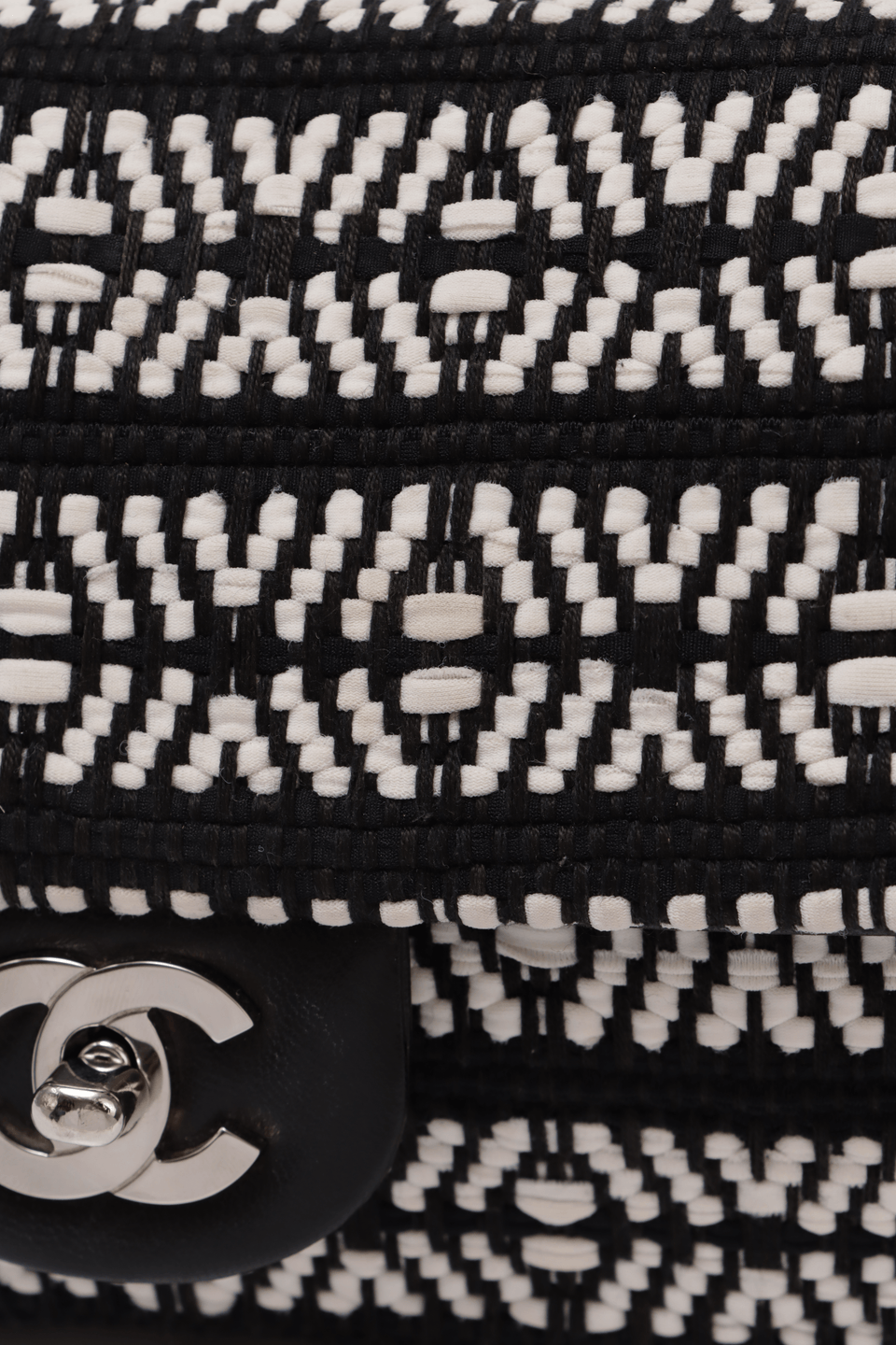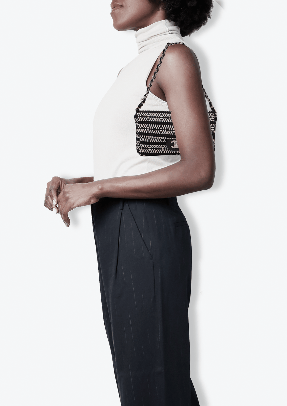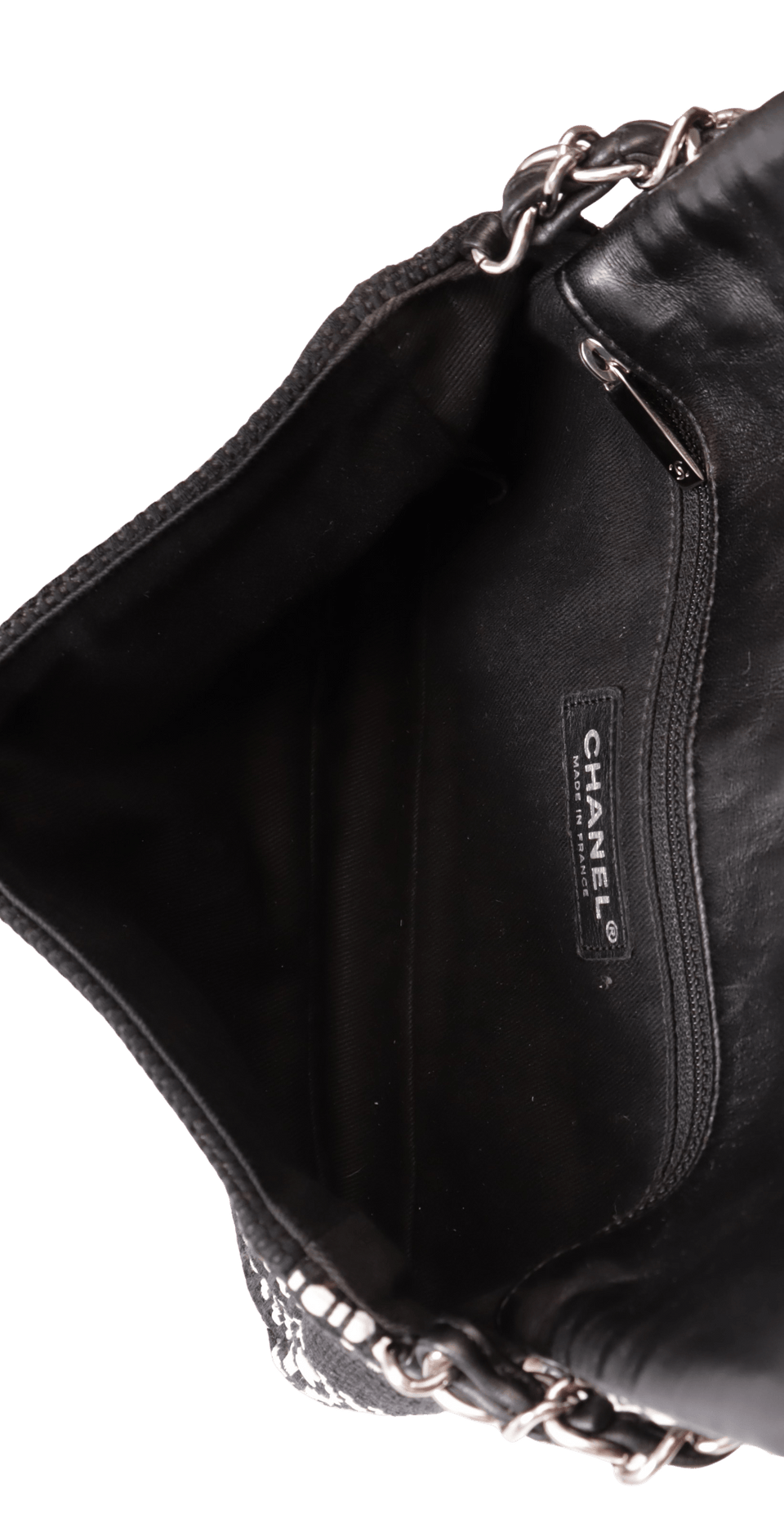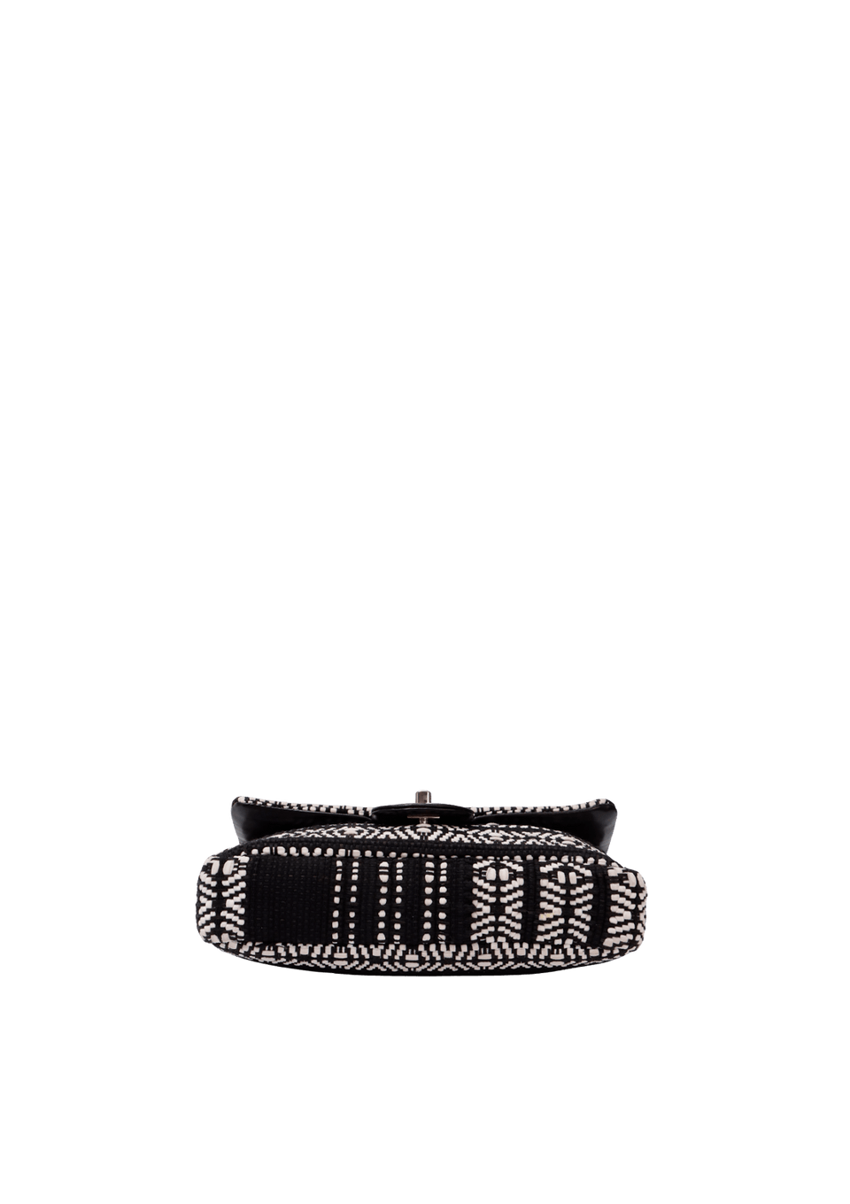 Descrição do Material: Tecido preto e branco com acabamento entrelaçado e detalhes em couro lambskin preto