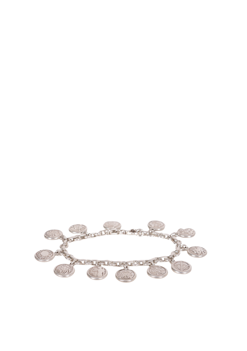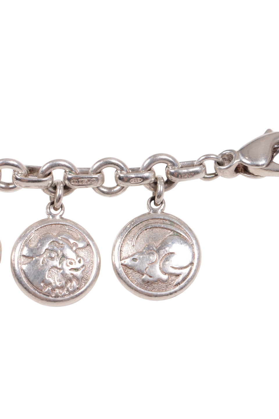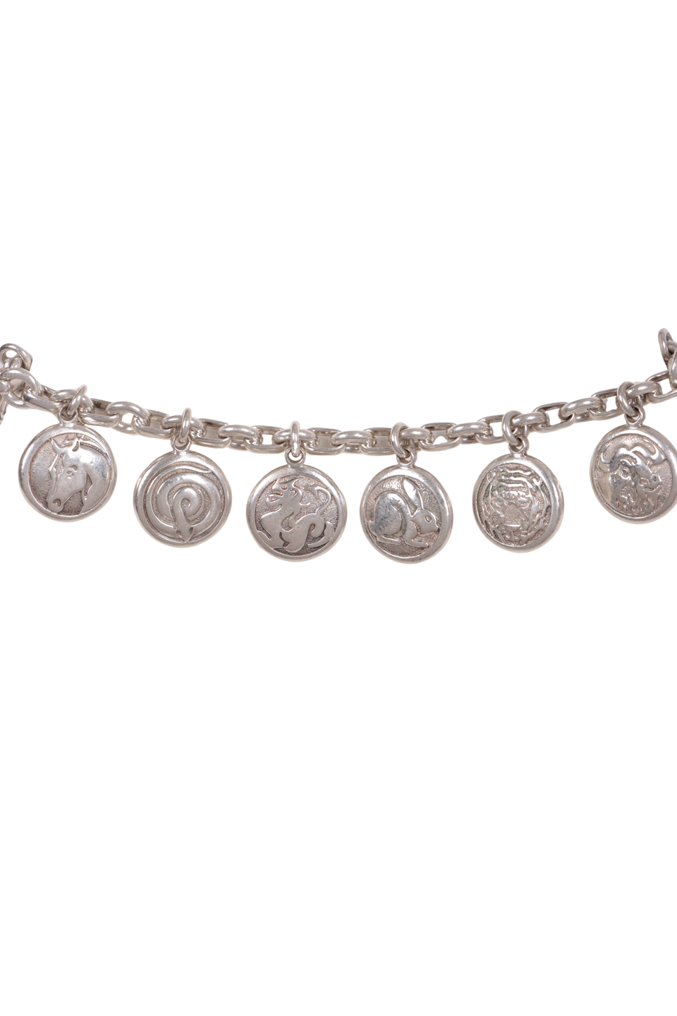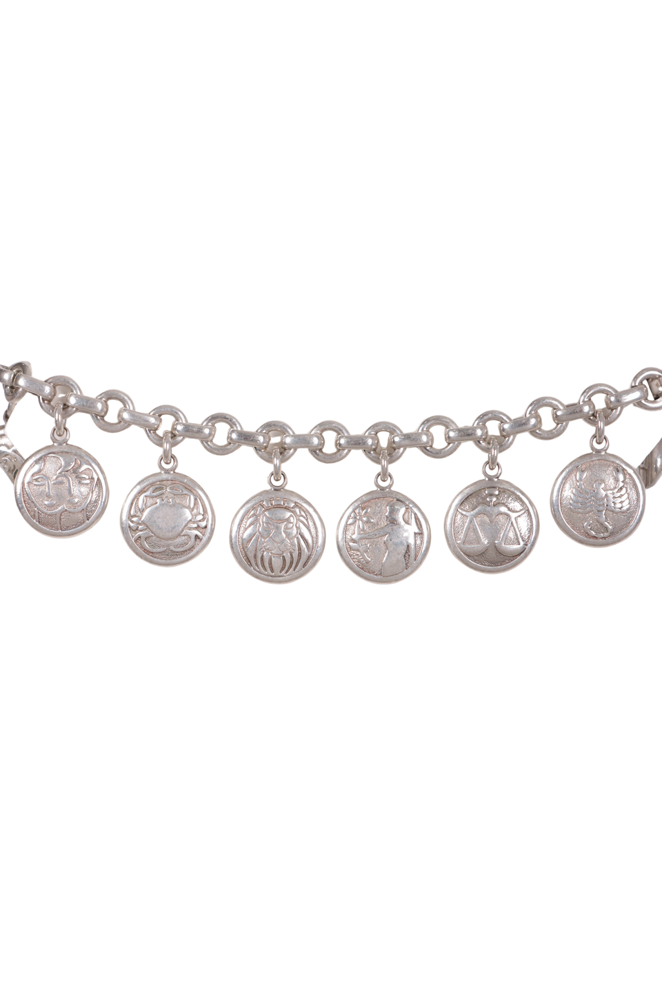 Bom, com aparência de usado. Apresenta leves marcas de uso pelo metal, especialmente nos pingentes, fecho e nas partes externas dos elos.
